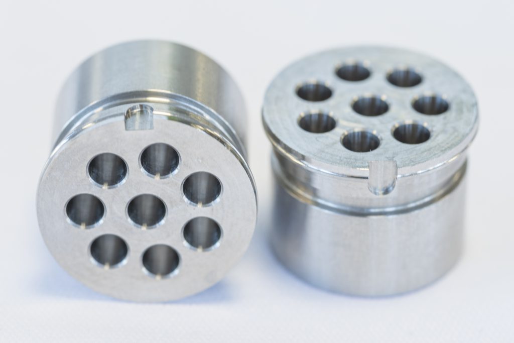 Was hier wenigen Worten ganz simpel beschrieben ist, stellt in der Praxis einen höchst komplexen Vorgang dar, der vor allem auf der Qualität des eingesetzten Bearbeitungszentrums basiert. In ihm fliegen feinste Späne, und es muss inklusive Finishing nur einmal umgespannt werden. Das ist insofern wichtig, weil die Anforderungen an Positions-, Winkel- und Durchmessertoleranzen der entscheidenden Bohrungen zu hundert Prozent zuverlässig im einstelligen µm-Bereich liegen müssen. Egal welcher Werkstoff zerspant wird.